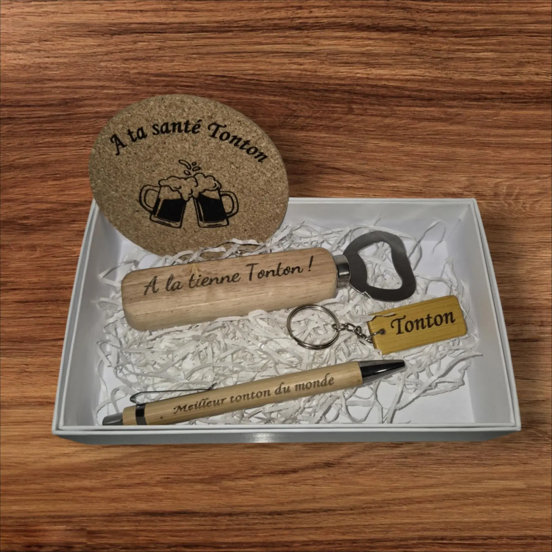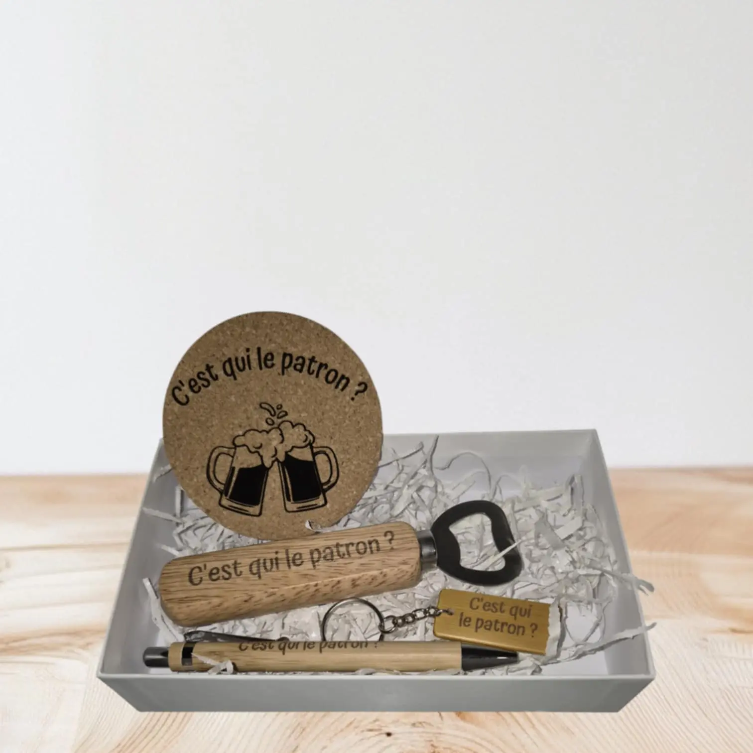 Découvrez notre coffret humour, idéal pour offrir au parrain, au papi, au tonton, ou à toute autre personne qui apprécie l'humour et l'apéro ! Dans ce coffret, vous trouverez un décapsuleur en bois, un dessous de verre en liège, un porte-clé en bois, un stylo en bambou et sa boîte cadeau. Parfait pour accompagner les moments de convivialité et de partage autour d'un apéritif, ce coffret est également un cadeau original et plein de caractère. Offrez un peu de bonne humeur et de fun avec notre coffret humour à la française !
